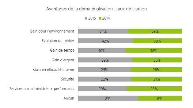 Les mairies interrogées ne citent les gains de temps et d’argent qu’en troisième et quatrième position. La dématérialisation est avant tout perçue comme bénéfique pour l’environnement. La possibilité de faire moins de tâches répétitives est en deuxième place. 8% des répondants ne perçoivent aucun avantage, soit 2% de plus par rapport à l’édition 2014.