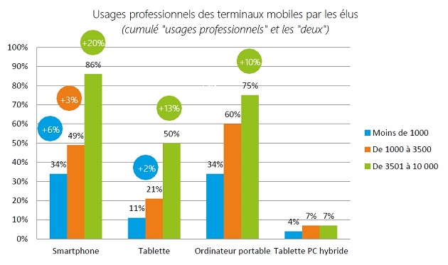 Les agents des villes de moins de 10 000 habitants utilisent encore assez peu les smartphones et les tablettes en situation professionnelle, sauf pour la strate des 3500 à 10 000 habitants, où l’usage des smartphones a progressé de 8 points. Les élus, eux, s’approprient de plus en plus les outils mobiles dans l’exercice de leurs fonctions. Les taux d’équipement les plus forts sont là encore dans les villes de plus de 3 500 habitants.