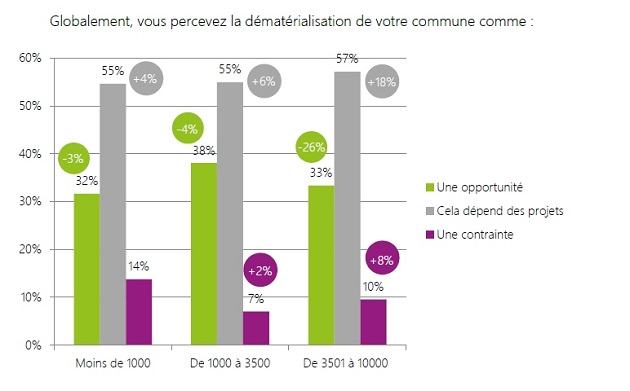 Cependant leurs attentes semblent quelque peu déçues ou moins manichéennes, puisque de plus en plus répondent que cela dépend des projets. La désillusion semble la plus forte pour les mairies de 3 500 à 10 000 habitants : elles ne sont plus que 33% à percevoir la dématérialisation comme une opportunité contre 59% l’an passé. A l’inverse, elles sont huit points de plus à la ressentir comme une contrainte.