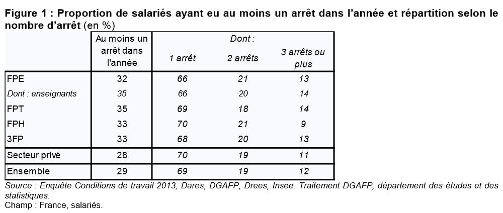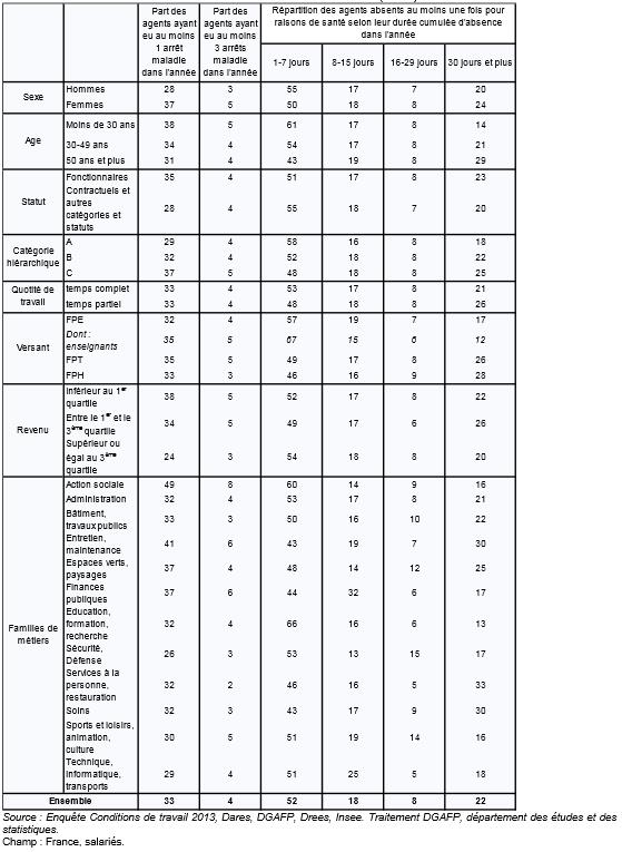 Sur l’absentéisme, les chiffres sont croisés avec ceux de l’enquête nationale « Conditions de travail » réalisée par l’Insee avec la Dares et la DGAFP et qui inclut désormais les fonctionnaires. Ainsi, un agent sur trois (35 % dans la fonction publique territoriale) a eu au moins un arrêt maladie dans l’année, pour 28 % des salariés du privé (32 % des effectifs de l’Etat et 33 % des hospitaliers). Mais pour 49 % de ceux qui s’arrêtent, l’interruption dure moins de huit jours, pour seulement 46 % des agents hospitaliers et des salariés du privé.