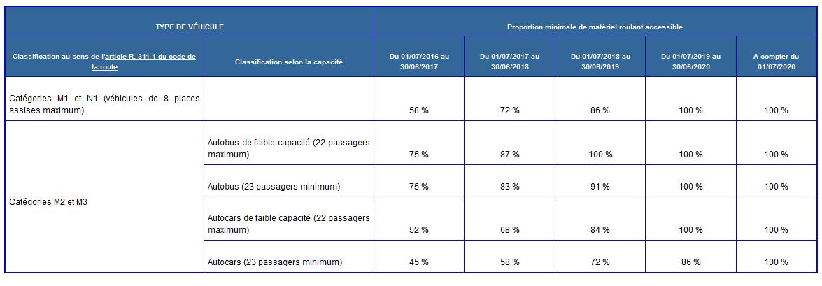 L’Ordonnance accessibilité du 26 septembre 2014 (articles L.1112-3, L.1221-4 et L.1221-10 du code des transports) a précisé que le matériel roulant routier, guidé et ferroviaire, mis en service à la date du 13 février 2015 (c’est-à-dire à l’expiration du délai de mise en accessibilité des réseaux fixée initialement par la loi handicap du 11 février 2005), peut continuer d’être exploité. Mais, dans le cadre d’un service de transport public routier de voyageurs, elle prévoit qu’une proportion minimum des autobus et autocars doit être accessible. Cette proportion vient d’être déterminée par un décret du 24 décembre 2015 en fonction du type de véhicules, avec un calendrier de mise en œuvre pour atteindre les 100% au plus tard le 1er juillet 2020.