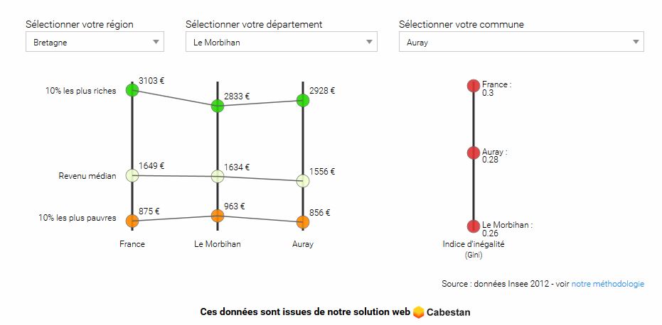 En plus du comparatif de revenus, l’outil du Compas fournit l’indice d’inégalité Gini de chaque commune, rapporté à celui du département et à la référence nationale. Pour Auray, l’indice Gini est de 0,28, celui du Morbihan, 0,26, et celui de la France, 0,3.