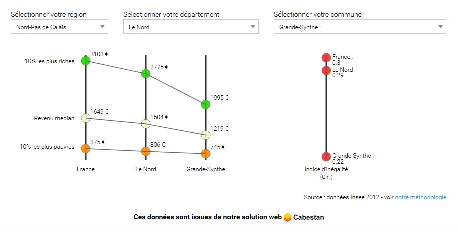 Le nouveau comparateur des territoires du Compas, bureau d’études spécialisé dans l’analyse des données sociales, offre, pour chaque commune de France métropolitaine, les informations suivantes : le revenu médian (revenu tel que la moitié des habitants considérée gagne moins et l’autre moitié gagne plus, donc distinct du revenu moyen) pour l’équivalent d’une personne adulte seule, la valeur maximale perçue par le décile des 10 % les plus pauvres et la valeur minimale pour les 10 % des plus riches.