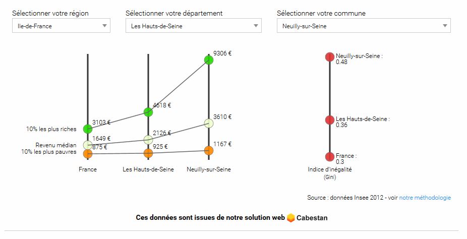 Les villes les plus inégalitaires en France sont, pour l’essentiel, les villes aisées situées en banlieue ouest de Paris, comme Neuilly-Sur-Seine (indice Gini de 0.48, le niveau de vie des plus riches y est huit fois supérieur à celui des plus pauvres), et Paris (0.43).