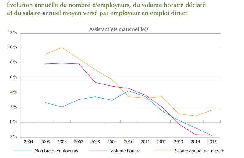 En 2015, 1,08 millions d’employeurs ont recours aux services de 337 0000 assistantes maternelles, soit 9500 de moins qu’en 2014, et 16500 de moins qu’en 2013.