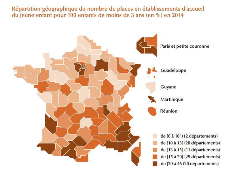 En 2014, les Eaje offrent 17,3 places pour 100 enfants de moins de 3 ans, contre 16,6 l’année précédente, tandis que l’accueil individuel se taille la part du lion, avec 33,1 places pour 100 enfants de moins de 3 ans, en progression de 0,2 points par rapport à 2013.