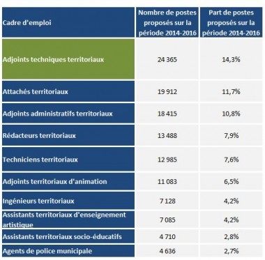 Sur 2014-2016, les communautés d’agglomération étaient pour leur part surtout à la recherche d’attachés territoriaux (17% des postes proposés), de techniciens (15%) et, en troisième position, d’adjoints techniques (10%).
