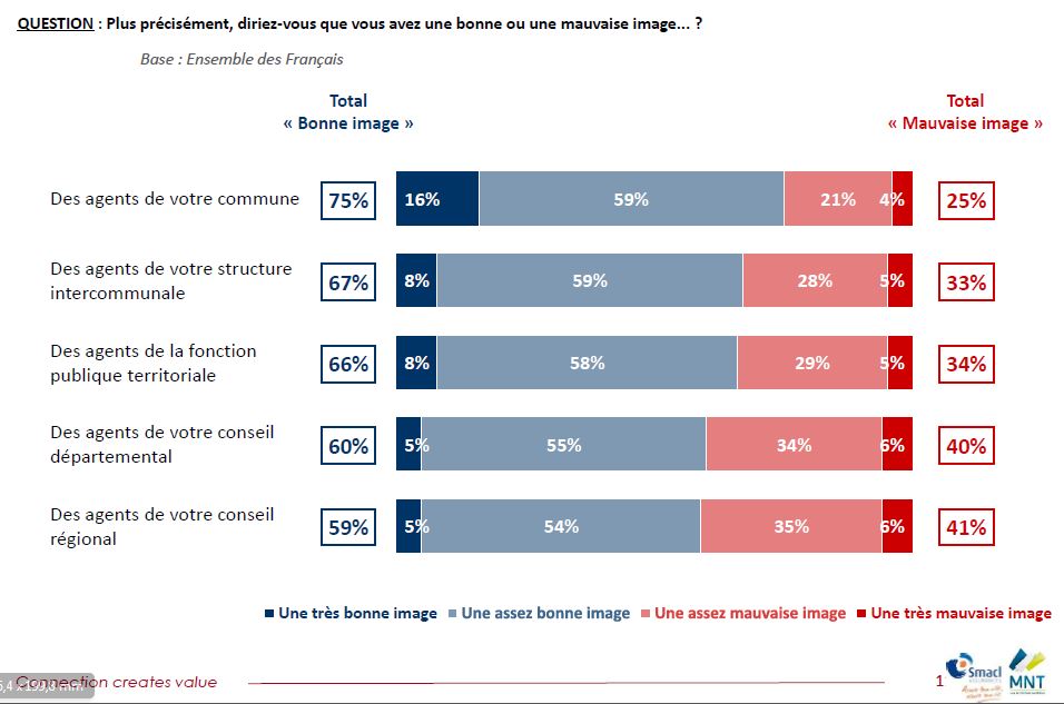 De fait, plus les agents de la fonction publique territoriale travaillent à proximité de leur domicile, plus les Français les apprécient. Preuve en est, 75% des sondés ont une image positive des agents de leur commune, contre 59% pour ceux qui exercent au conseil régional.