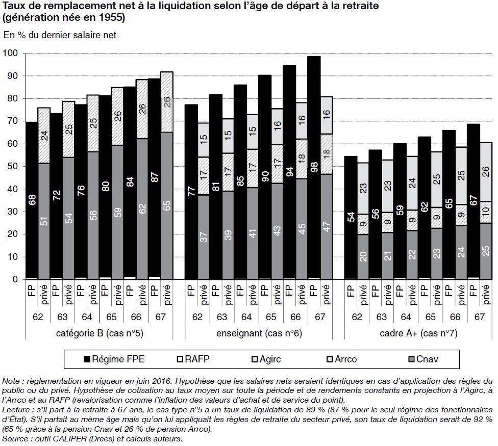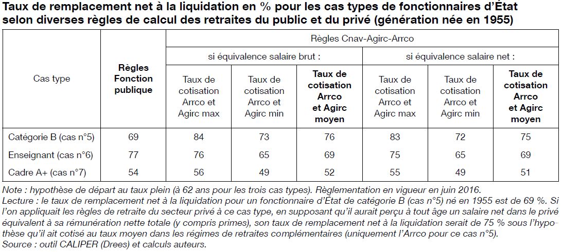 Ainsi, le taux de remplacement (qui rapporte la première pension à la dernière rémunération totale) est de 72,1 % pour les fonctionnaires et 73,8 % pour les salariés du privé (nés en 1946 ayant une carrière complète).
