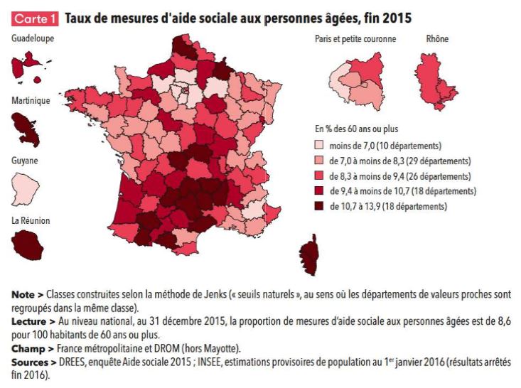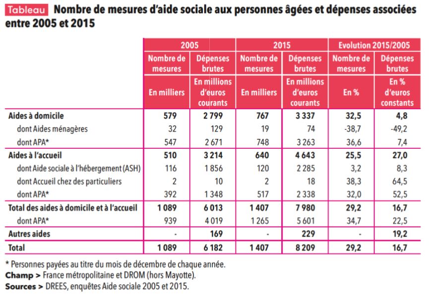 Fin 2015, 1,4 million de mesures d’aide sociale ont été allouées aux personnes âgées dépendantes. Au total, les départements ont dépensé 8,2 milliards d’euros, dont 5,6 milliards pour l’Allocation personnalisée d’autonomie (APA). 1,3 million de personnes âgée touchaient l’APA en décembre 2015 : 41 % pour l’APA en établissement et 59 % pour l’APA à domicile.