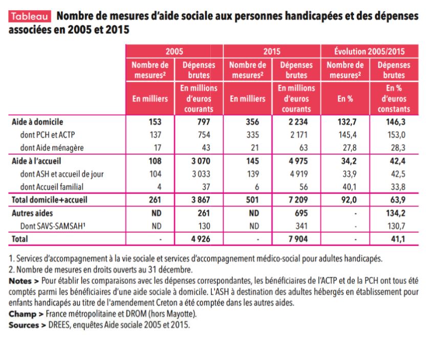 Les département ont déboursé 7,2 milliards d’euros en 2015 pour l’aide aux personnes handicapées (hors bénéficiaires de SAVS [Services d’accompagnement à la vie sociale] et SAMSAH [Services d’accompagnement médico-social pour adultes handicapés], dont 2,2 milliards pour l’aide à domicile et 5 milliards pour l’aide à l’accueil. Cette somme a augmenté de 86 % en dix ans.