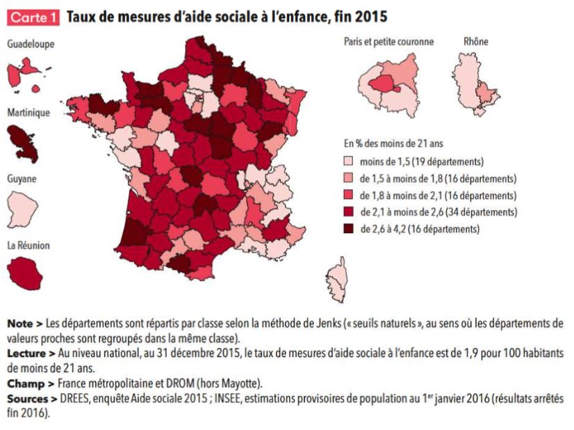 Enfin, la protection de l’enfance a représenté, en 2015, une dépense totale de 7,7 milliards d’euros. Au 31 décembre, 325 000 mesures d’ASE (Aide sociale à l’enfance) étaient en cours. Le nombre de mesure varie fortement d’un territoire à l’autre : de 0,9 à 4,2 % des moins de 21 ans :
