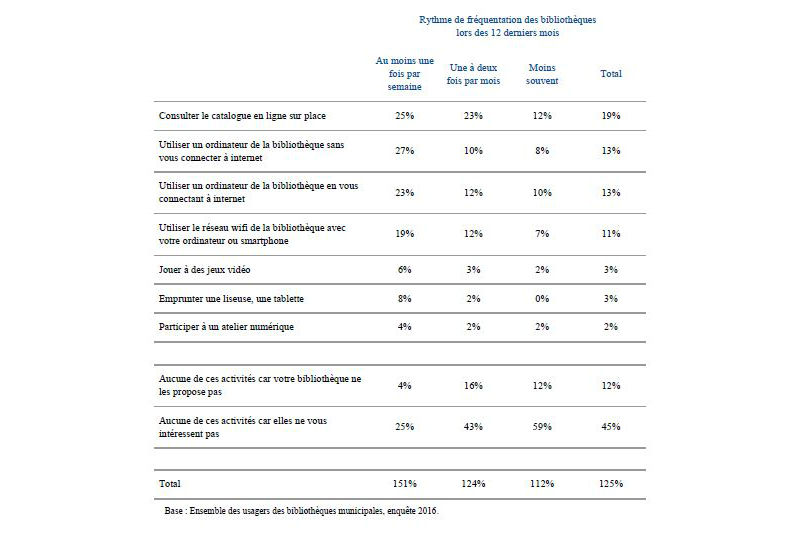 « Bien que la bibliothèque municipale continue de bénéficier d’une forte légitimité, y compris chez les non usagers, la tendance selon laquelle elles ne constituent plus un lieu ‘sacralisé’, mais un équipement dont on peut interroger la fonction progresse chez ces derniers, notamment au regard des évolutions numériques de la société, analysent les auteurs. On notera également que les non usagers absolus qui jugent les bibliothèques municipales peu utiles n’ont pas de connaissance directe de l’offre proposée aujourd’hui par ces bibliothèques, offre qui a fortement évolué au cours de la dernière décennie. »