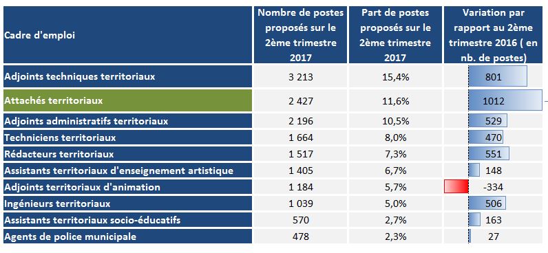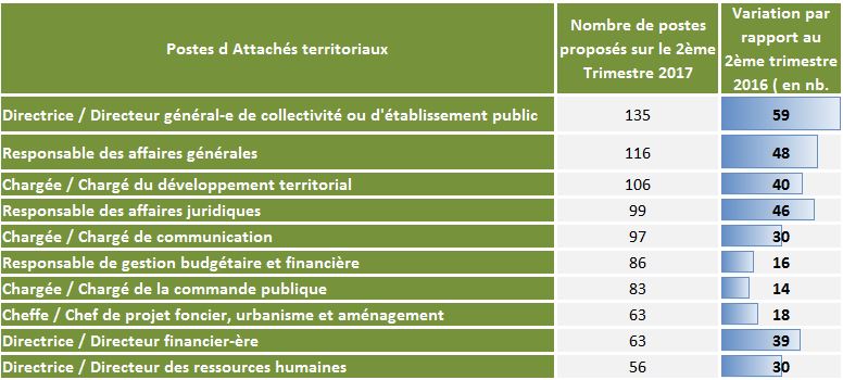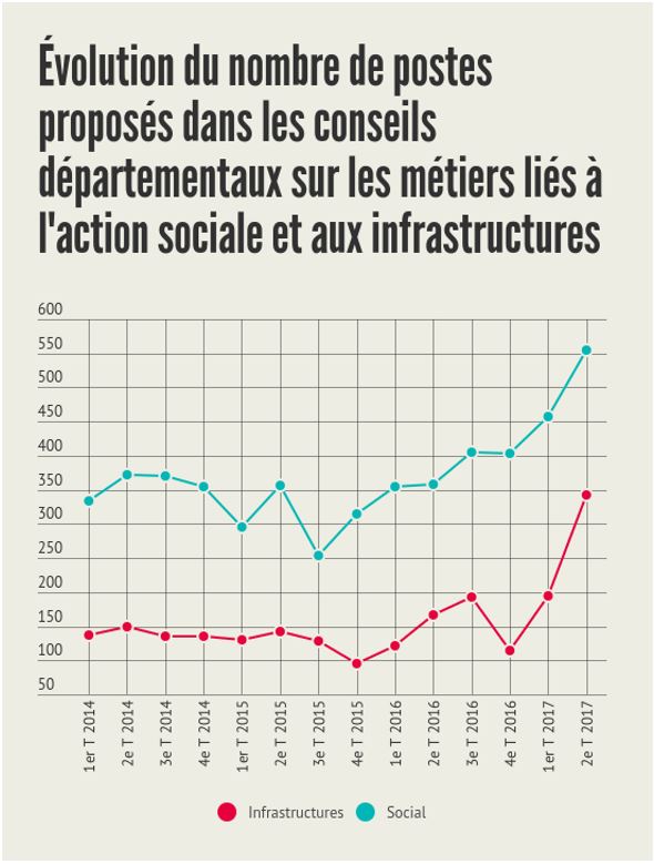 Les postes d’attachés territoriaux sont plus demandés qu’au deuxième trimestre 2016. « On assiste probablement davantage à un renouvellement des équipes qu’à une recherche accrue », selon Luc Roussillon. Pour qui le renouvellement des effectifs explique sans doute aussi la variation à la hausse du nombre de postes proposés par les conseils départementaux, en particulier dans les domaines du social et de l’infrastructure, « leurs effectifs n’ayant pas ou très peu augmenté ».