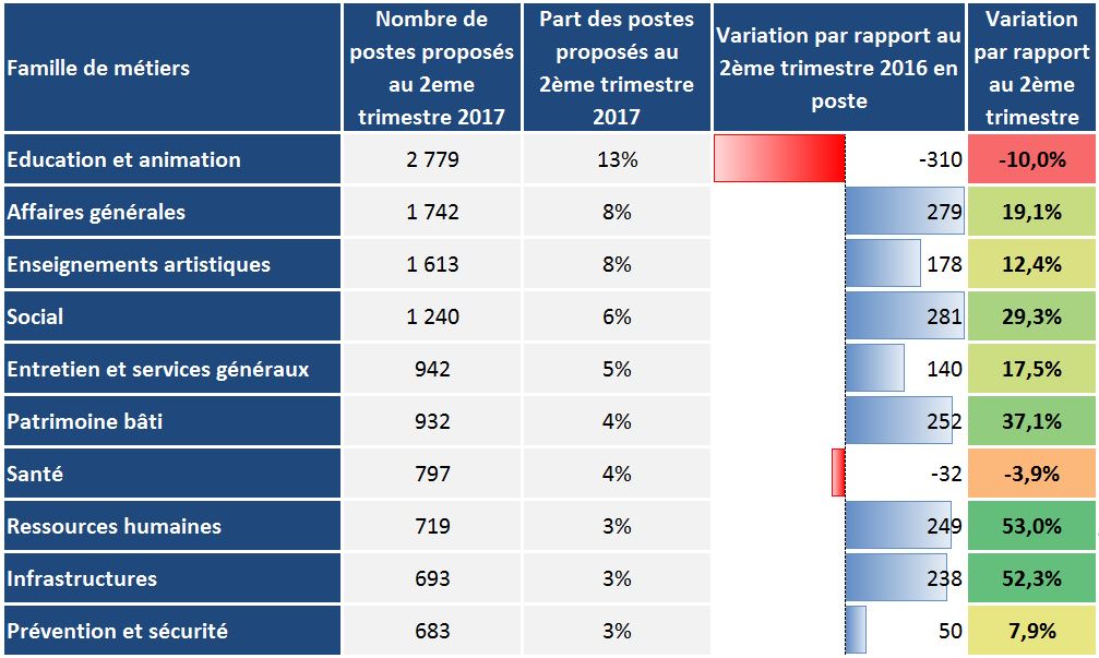 Plus généralement, la FNCDG et l’ANDCDG observent une hausse de 23,2% du nombre de postes proposés (20 879 au total) par rapport au deuxième trimestre 2016. Elle est toutefois à nuancer : les collectivités se saisissent de plus en plus de l’outil des bourses de l’emploi public local.