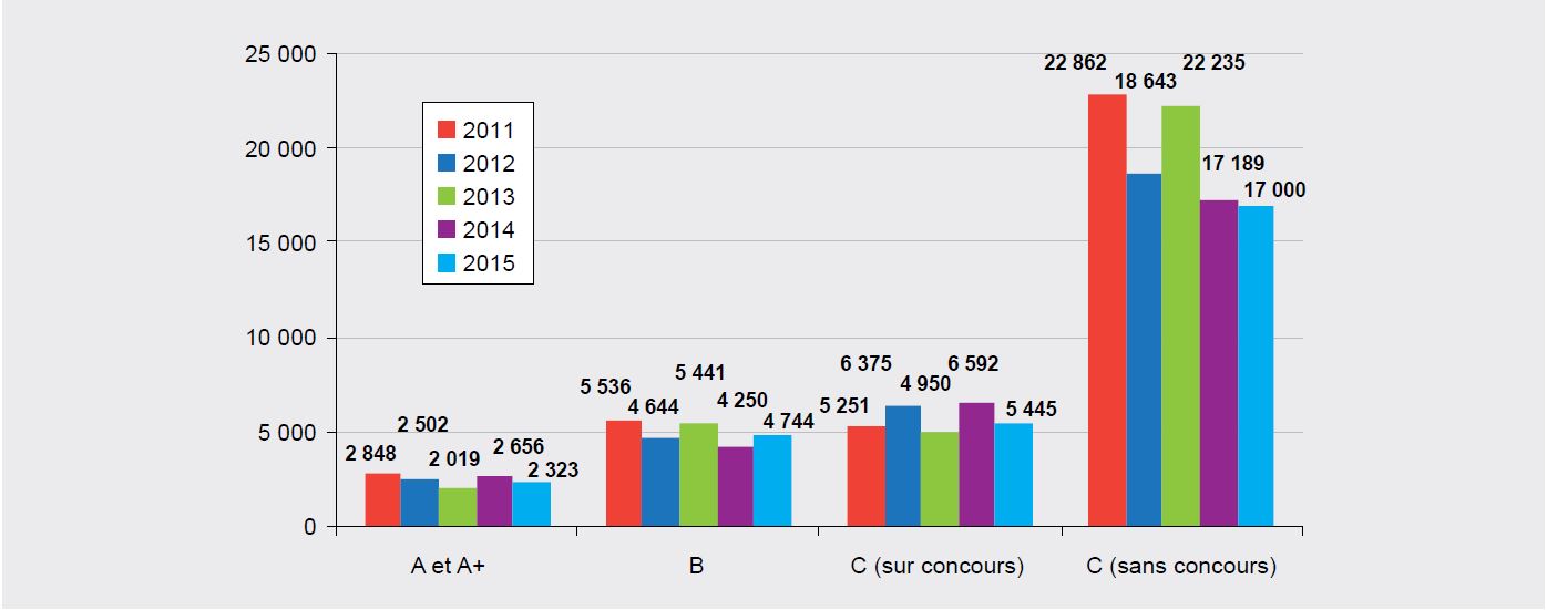Cette année-là, les recrutements externes sur concours dans la FPT ont diminué par rapport à 2014 : ils étaient 12 512 (contre 13 498 en 2014) auxquels s’ajoutaient 17 000 recrutements externes sans concours (17 189 en 2014). La part des entrées sans concours est restée majoritaire : 58 % en 2015, soit 2 points de plus qu’en 2014. Les recrutements sur concours en catégorie B ont augmenté de 11,6 % alors que ceux de catégories A et C sur concours ont chuté (respectivement en baisse de 333 et 1 147 agents). Sans prendre en compte la ville de Paris, la sélectivité des recrutements sur concours en 2015 se situait à 3,5 candidats présents pour un admis en catégorie A. Elle était plus forte pour les catégories C avec un candidat admis pour 6,8 présents.