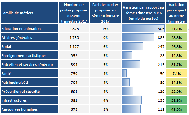 Cette dernière a vécu la plus importante progression par rapport au 3e trimestre 2016 (environ +52%). « Globalement, les collectivités étaient en quête de personnels dans le domaine de la voirie et des réseaux », décrypte Erwan Maheas. « Cela peut notamment s’expliquer au regard des transferts de compétences vers les intercommunalités. »