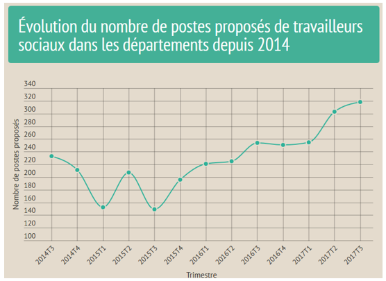 Autre augmentation continue remarquée depuis fin 2015 : celle des postes proposés de travailleurs sociaux dans les départements. Les demandes de ces derniers ont crû de 64% entre le 3ème trimestre 2016 et le 3ème trimestre 2017. Cela s’explique par le fait que « les départements, chefs de file de l’action sociale, ont dû répondre à une demande sociale en progression incessante », d’après Erwan Maheas.