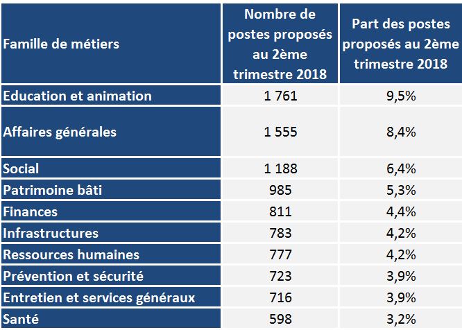 Caractérisée par ses missions contractuelles, justement, la famille de métiers Éducation et animation figure, comme chaque année à cette période, à la première marche du podium (9,5 % des postes proposés à temps complet au deuxième trimestre 2018).
