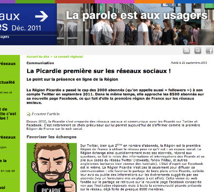 De son côté, la région Picardie ne reste pas les bras croisés. Dans un billet du 22 septembre 2011, la collectivité annonce avoir passé le cap des 2000 « followers » à son compte Twitter en septembre 2011. Elle rappelle du même coup qu’elle recense aussi 8500 abonnés sur sa nouvelle page Facebook, ce qui ferait d’elle la première région de France sur les réseaux sociaux.