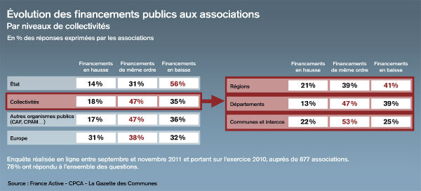 Réalisée en ligne entre septembre et novembre 2011 auprès de 877 associations, l’enquête met en évidence que 69 % des associations interrogées ont vu au moins un de leurs financements publics baisser. Sans surprise, les subventions de l’Etat sont les plus concernées, puisque 56 % des associations sont touchées. Mais les collectivités territoriales marquent aussi le pas : 35 % des associations sont impactées par une baisse.