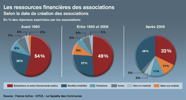 L’un des apports de l’enquête est de démontrer que la structuration financière varie fortement selon l’âge de l’association. Ainsi, pour les associations créées avant 1960, les ressources publiques sont très importantes, alors qu’à l’inverse, pour celles crées après 2006, les recettes d’activités sont majoritaires dans le budget.